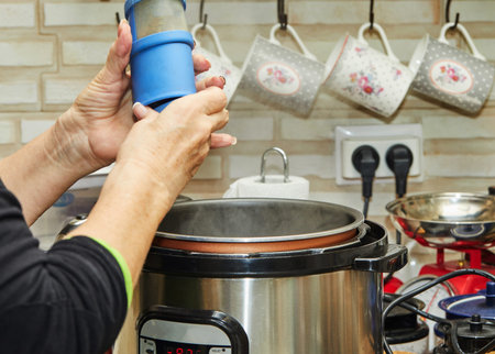 Cooking meat in a slow cooker, a woman peppers the meat.