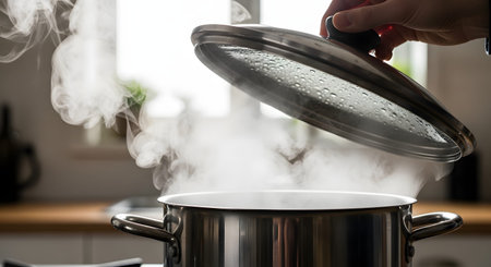 A hand lifts the glass lid off a stainless steel pot, releasing a large cloud of white steam. The dynamic cooking scene is set in a kitchen, highlighting the heat and preparation of a hot meal.
