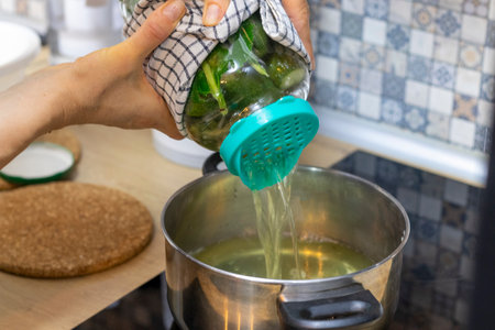 Person straining jar with pickles