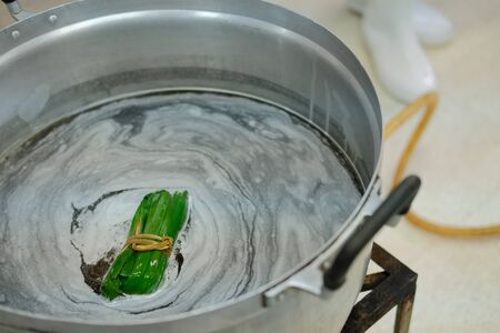 boiling pandan leaves to get fragrance in hot soup water in pot