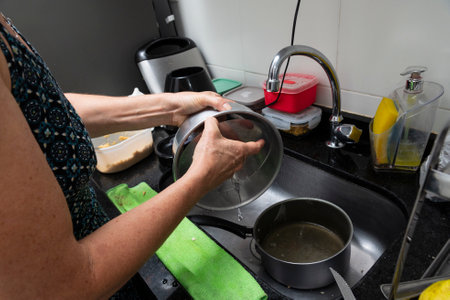 Woman cleaning stainless steel pan at kitchen sink. Family gastronomy. Salvador, Bahia, Brazil