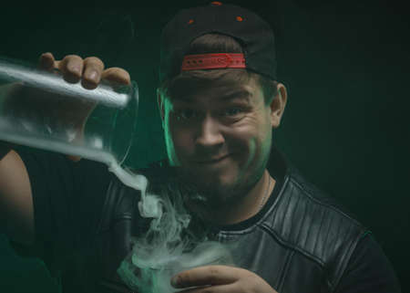 Person chemist holds test tube of glass in his hand with acid. Steam or smoke from a reaction from mixing chemicals