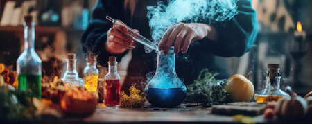 Vintage witch performs magical ritual, with elixir in hand on the eve of Halloween