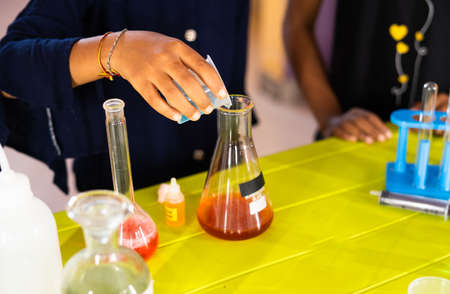 unrecognizable school kid adding chemical solution drops in to filtering flask at chemistry laboratory - concpet o f science experiment, child development and education.