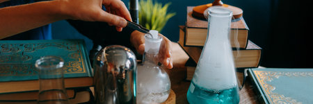 Witchcraft. Witch doctor desk table. Magic potion. ALternative medicine concept. Divination, love potion. Mysterious clouds of smoke.