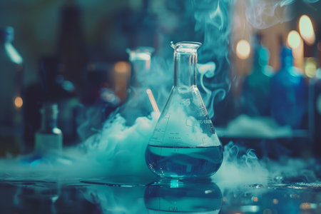 Pharmacy and chemistry theme. Test glass flask with solution in research laboratory. Science and medical background. Laboratory test tubes on abstract explosion cloud background. Selective focus