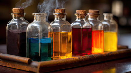 Several glass vials, flasks filled with colorful liquids are neatly displayed on a laboratory table. The workspace is well-lit, creating an inviting atmosphere for experimentation. Selective focus.