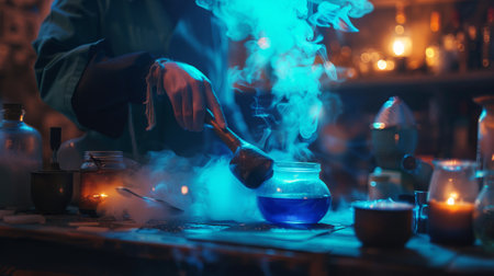 vibrant blue potion sits in a glass bottle, surrounded by green plants and soft candlelight. Smoke gently swirls around a mystical scene, creating an enchanting atmosphere.