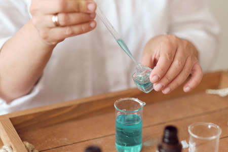 Close-up of a pipette with oil and a glass bottle. woman pouring perfume in bottle. Perfume creating workshop