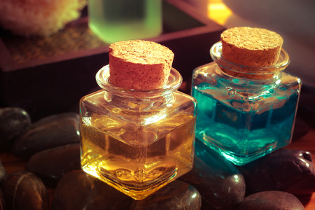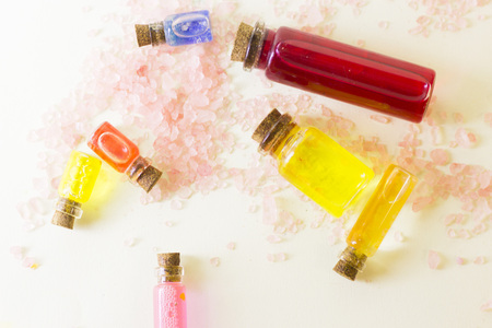 Aromatherapy and spa concept background- glass jars of fruit and flower essential oil closed with corks, pink bath salt grains lying on the table, top view. Space for a text or product display.