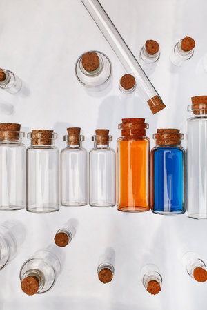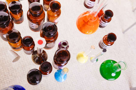 Several glass vials, flasks filled with colorful liquids are neatly displayed on a laboratory table. The workspace is well-lit, creating an inviting atmosphere for experimentation. Selective focus.