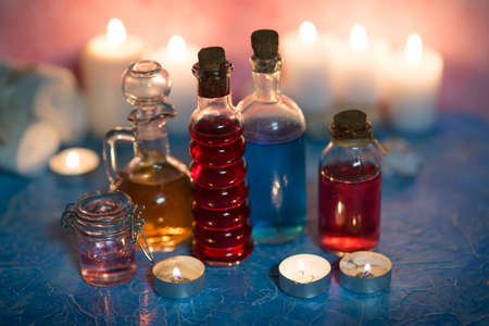 Witchcraft. Witch doctor desk table. Magic potion. ALternative medicine concept. Divination, love potion. Mysterious clouds of smoke.
