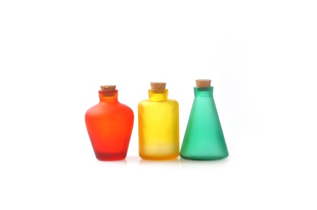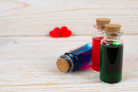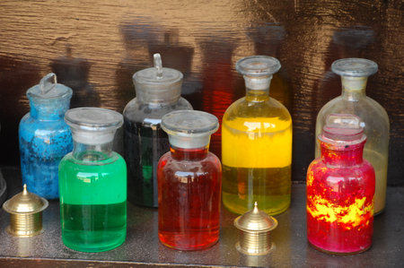 Colorful potion bottles in a pharmacy shop, closeup of photo