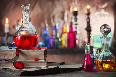 flasks of magic potions with poison in the workshop of an alchemist witch