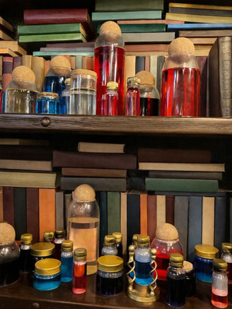 Magic Potions and Antique Books on Wooden Alchemist Library Shelves