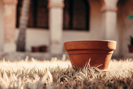 Terracotta flower pot on dry grass in a rustic outdoor setting