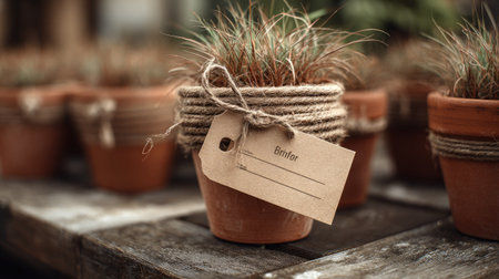 This charming image features terracotta pots adorned with twine holding vibrant green plants. Ideal for home decor and gardening inspiration.