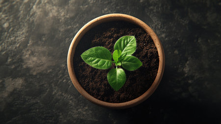 A vibrant green plant emerges from rich soil in a terracotta pot, symbolizing growth and vitality. Ideal for themes of nature and gardening.