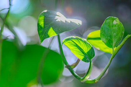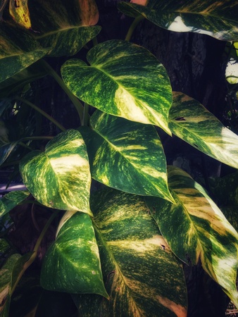 Leaves of a money plant, Epipremnum aureum, in a rainforest