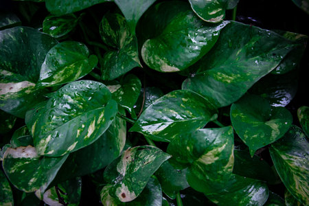Epipremnum aureum or golden pothos plant with water drop on the raining day texture background. Abstract tropical green leaf textured background, large foliage, background for green nature.