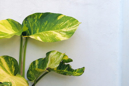 Close up of Golden pothos leaves on white wall background.
