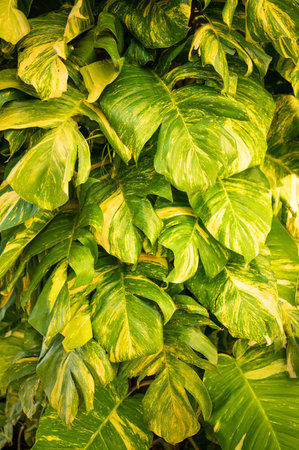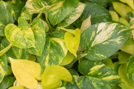 Natural background of Epipremnum aureum plants, beautiful golden and neon color of leaves heart-shaped. Ornamental plant for garden decoration.