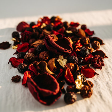 Exquisite dried botanicals and aromatic spices artfully arranged, evoking warmth, natural beauty, and sensory delight for wellness and decorative projects.