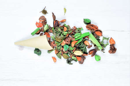 Colorful assorted potpourri in a bowl on a wooden table