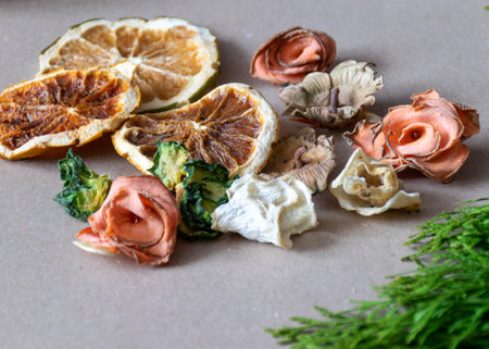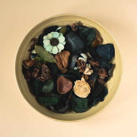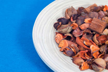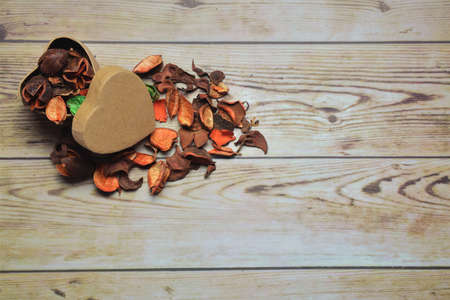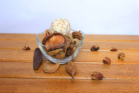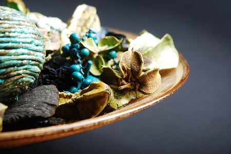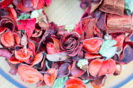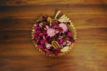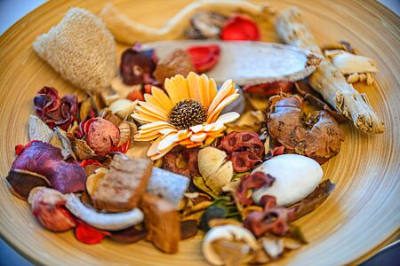 Potpourri in the wooden plate on the table.