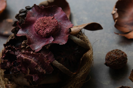 A decorative mix of natural elements including a deep burgundy dried flower, pine cones, seed pods, and textured bark pieces arranged in a rustic nest-like base
