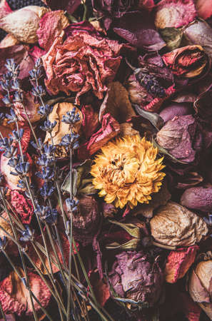 Scented potpourri of dried flowers as background, top view