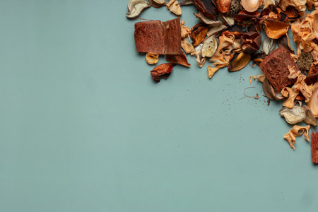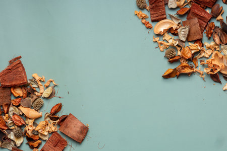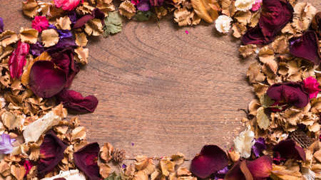 aromatherapy potpourri mix of dried aromatic flowers on wooden background with copy space