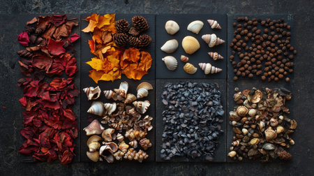 Explore a stunning flatlay featuring vibrant autumn leaves, a collection of unique shells, and intricate textures, ideal for creative projects and seasonal decor.