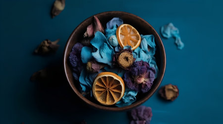 Dried fruit and flowers in a bowl on a blue background.