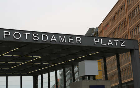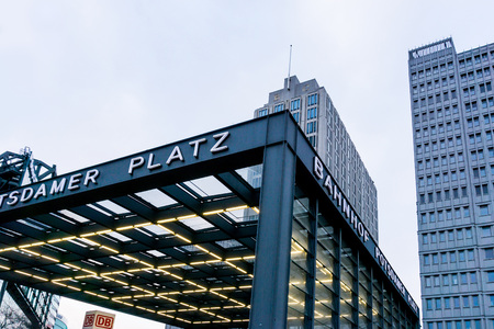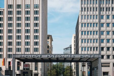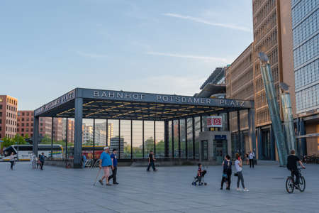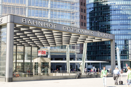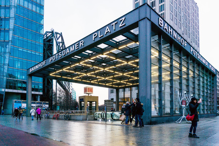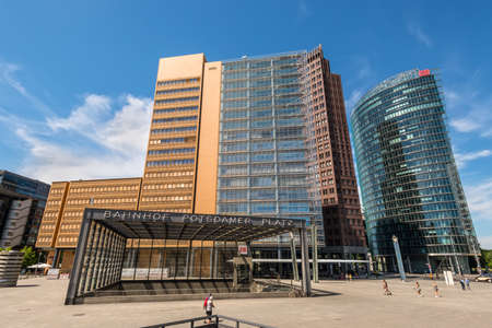 Berlin, Germany - May 28, 2017: Entrance to the Bahnhof Potsdamer Platz station, at Potsdamer Platz, an important square in the center of the city, with many buildings built after the fall of the Wall.