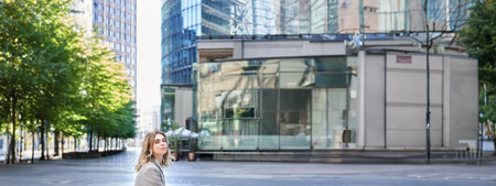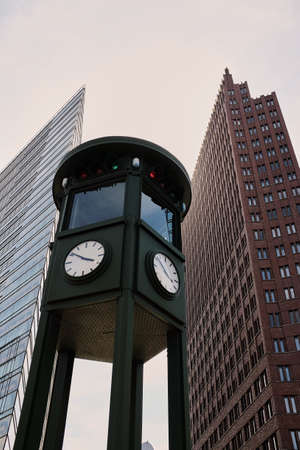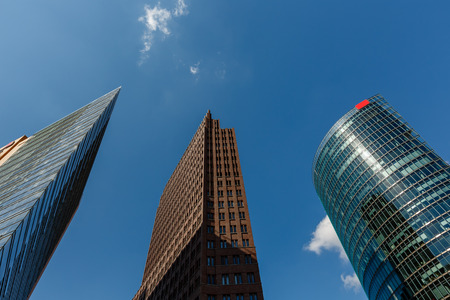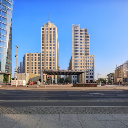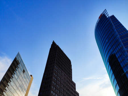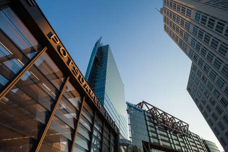 Potsdamer platz in Berlin, Germany. Destination for tourism and business at skyscrapers offices. Blue sky background, banner.