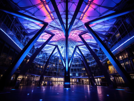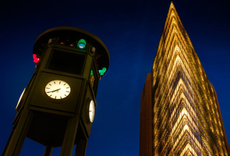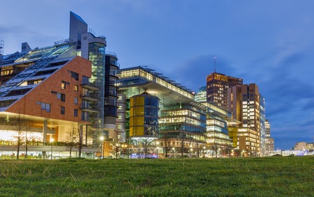 BERLIN, GERMANY - NOVEMBER 13, 2018: Modern futuristic architecture at night in Tilla Durieux Park in front of Potsdamer Platz. Berlin is the capital and German largest city by area and population.