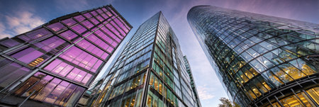 Low angle, full shot of three modern skyscrapers in a city, with glass facades and reflective surfaces. The skyscrapers are set against a colorful sky with some clouds. The image highlights the architectural details of the buildings.