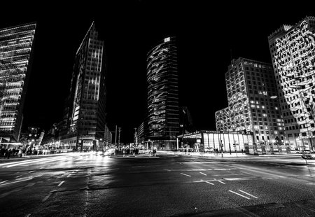 BERLIN - OCTOBER 07, 2018: Modern skyscraper at Potsdamer Platz in the event illuminations. Black and white. Festival of lights 2018.