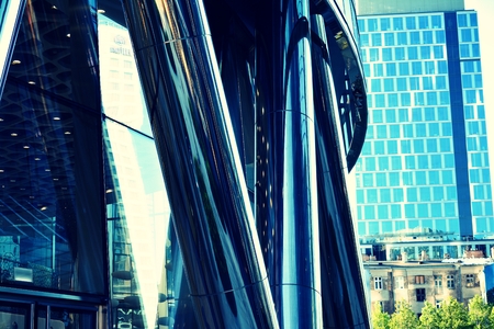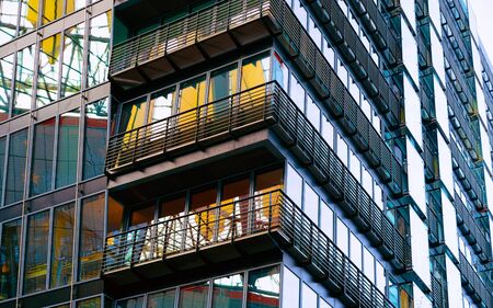 Modern office building facade abstract fragment, shiny windows in steel structure, retro stylized colorful tonal filter effect
