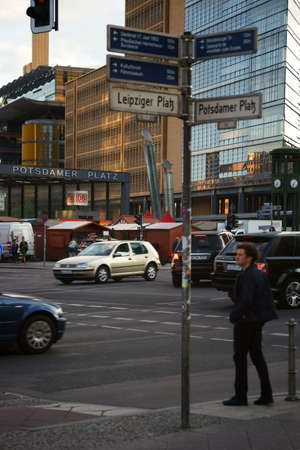 Berlin, Germany - May 10, 2016: Road traffic passing a way sign at the Leipzig and Potsdam Square with distances to various attractions on May 10, 2016 in Berlin.