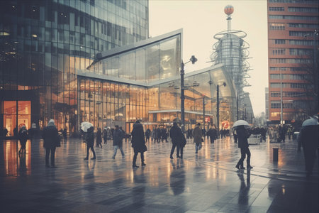 Modern mall office environment crowds of people going to work exposition groups of businesspeople in modern tech park business advancements meeting sun shining through huge windows architectural park
