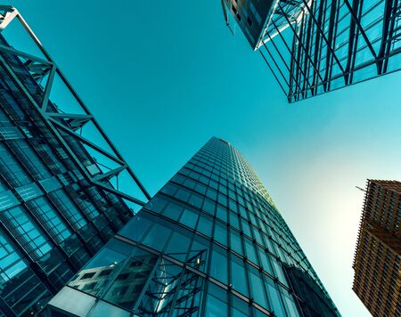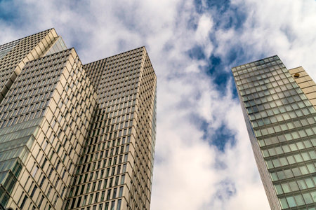 Berlin,Germany , August 21, 2018. Two modern high-rise buildings in the central square of the eurupean capital against the sky on a sunny day at sunset in an unusual perspective
