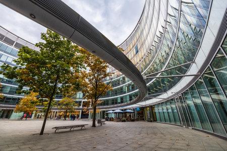 BERLIN, GERMANY - OCTOBER 3, 2019: The modern glass buildings of variety purposes at the Hauptbahnhof (Central railway station) area, on October 3 in Berlin