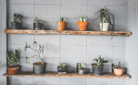 Variety of cactus and succulent growth in pot on wooden shelf in shop. Small plant for home or office.