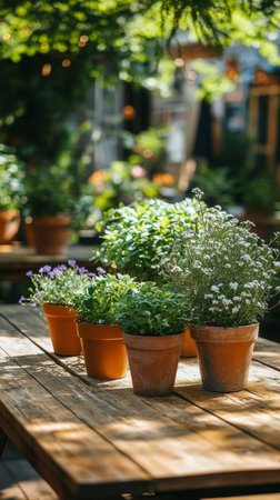 A collection of potted herbs and flowers, including green basil and purple blooms, is arranged on a weathered wooden table. Sunlight filters through trees, creating a serene atmosphere for gardening.