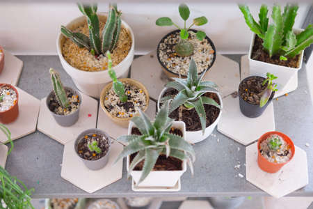 Many small potted cactus in box, planted indoor near window Close up cactus in pot near the window. Selective focus and blurred background