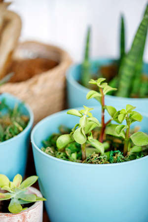 Succulent home plants - pachyphytum, sansevieria and gasteria on the wooden table close-up, mini plants and home gardening concept