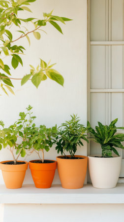 A bunch of plants in pots sitting on a window sill, AI