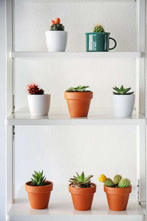 Rack with different succulents in pots near white wall